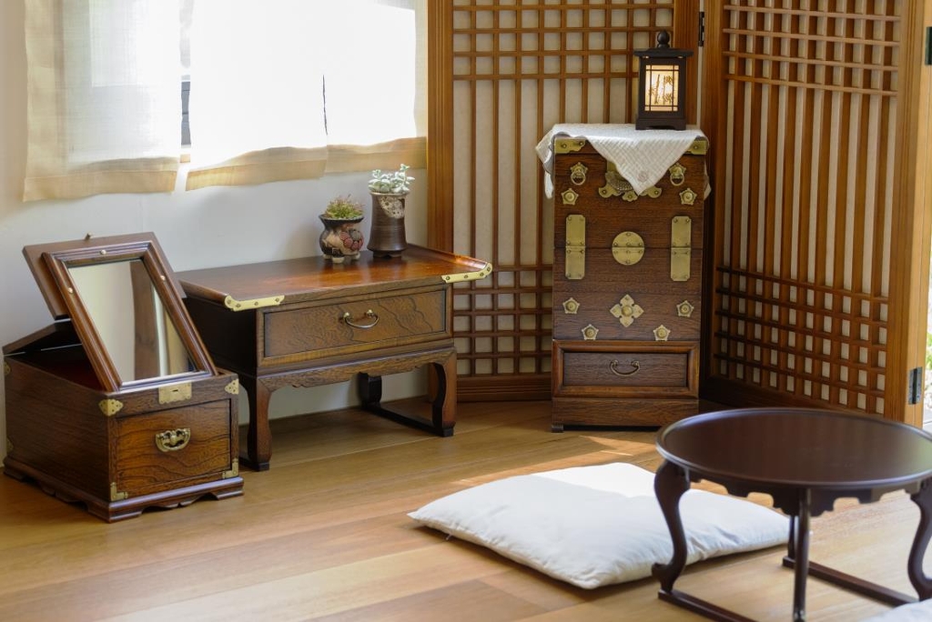 한쪽에는 한복과 우리 전통의 쟁반과 소반 등이 자리 잡고 있다.