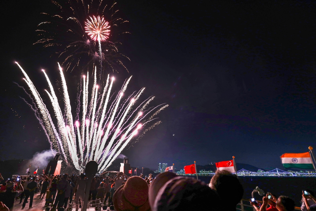 주말 밤바다 위에서 불꽃 쇼가 펼쳐졌다. 밤하늘 위로 솟구쳐 터지는 불꽃에 사람들은 감탄했다.
