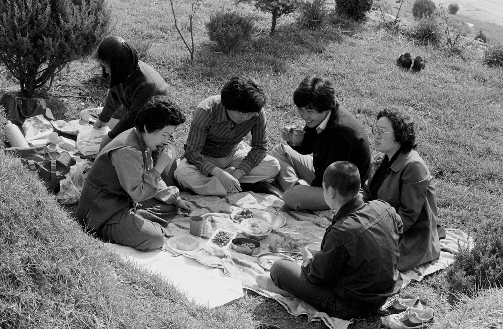 | ▲ 추석을 맞아 조상의 묘를 찾은 일가족이 차례를 지내고 음복하고 있다. 1980년 [한치규 제공] |