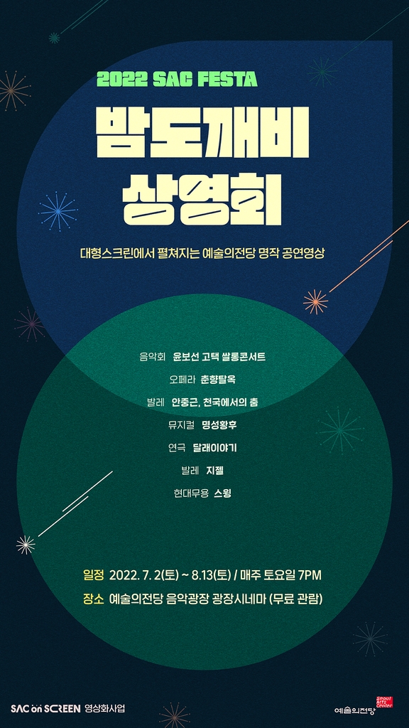 ▲ 예술의전당 '밤도깨비 상영회' = 예술의전당은 다음 달 2일부터 8월 13일까지 '밤도깨비 상영회'를 마련한다. 예술의전당이 직접 제작한 초고화질 공연 영상을 예술의전당 서예박물관 외벽에 설치된 대형 LED 스크린으로 무료로 즐기는 야외 상영회다.