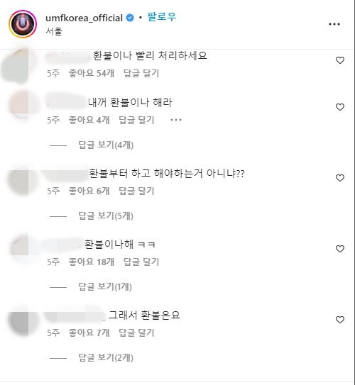 이처럼 환불 절차가 끝나지 않았음에도 유씨코리아가 '울트라 코리아 2022'를 오는 24∼25일 개최한다고 알리자 해당 게시물이 올라온 소셜미디어(SNS) 계정에는 환불을 요구하는 댓글 등 불만이 이어졌다.