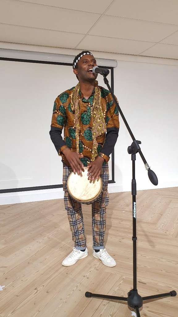 | ▲ 노래 부르는 남아공 '프린스' (프리토리아=연합뉴스) 김성진 특파원 = 20일(현지시각) 주남아공 한국문화원에서 하하베 종족의 왕자인 프린스 시즈웨 베나가 북을 다리 사이에 끼운 채 노래를 부르고 있다. 2022.5.20 sungjin@yna.co.kr |