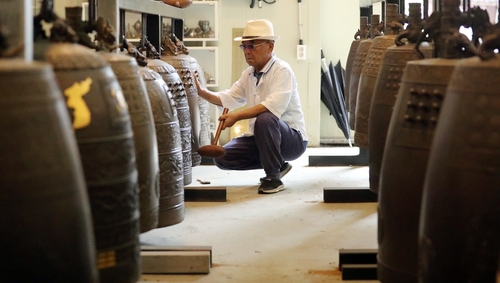 | ▲ 제작한 종을 쳐보며 소리를 확인하는 원광식 주철장 [촬영 천경환 기자] |
