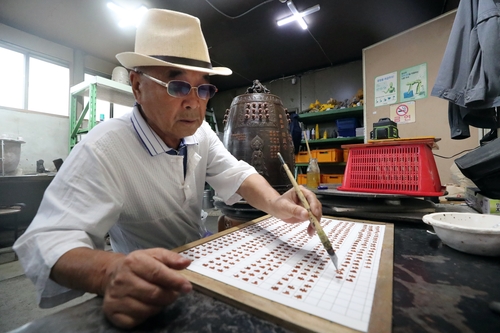 | ▲ 범종에 새겨넣을 글자 작업을 하는 원광식 주철장 [촬영 천경환 기자] |