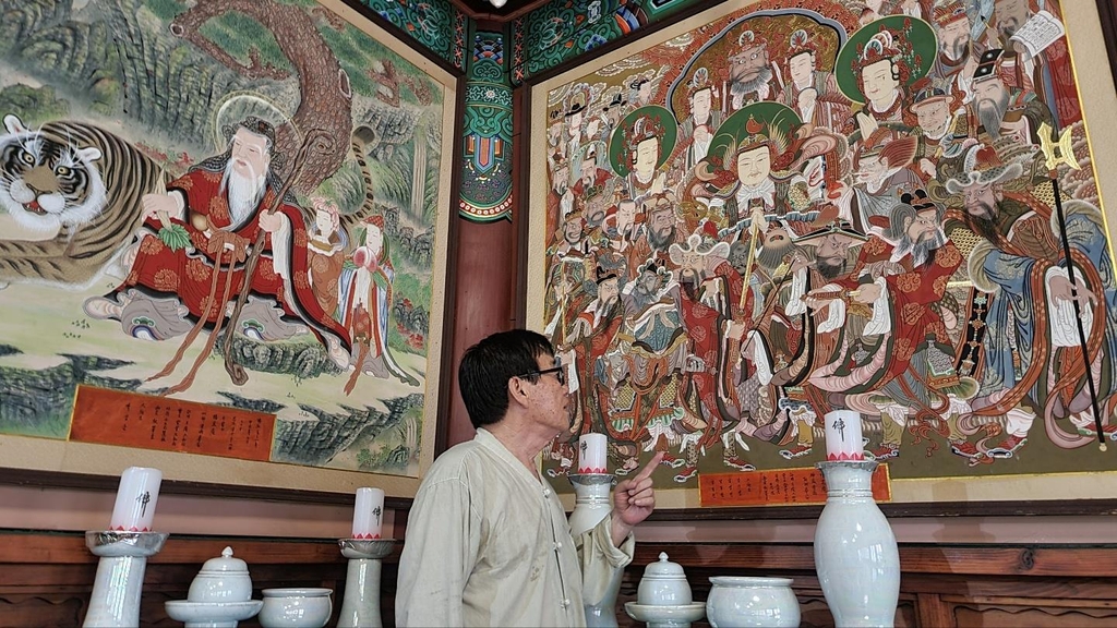 | ▲ 탱화 설명하는 권현규씨 (청주=연합뉴스) 천경환 기자 = 청주시 청원구 내덕동 작업실에서 단청장 기능 보유자인 권현규씨가 탱화에 대해 설명하고 있다. 2022.8.19.