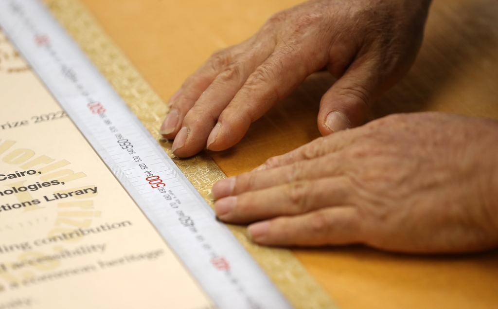 | ▲ 유네스코 직지 상장을 만지는 홍종진 배첩장 [촬영 천경환 기자] |