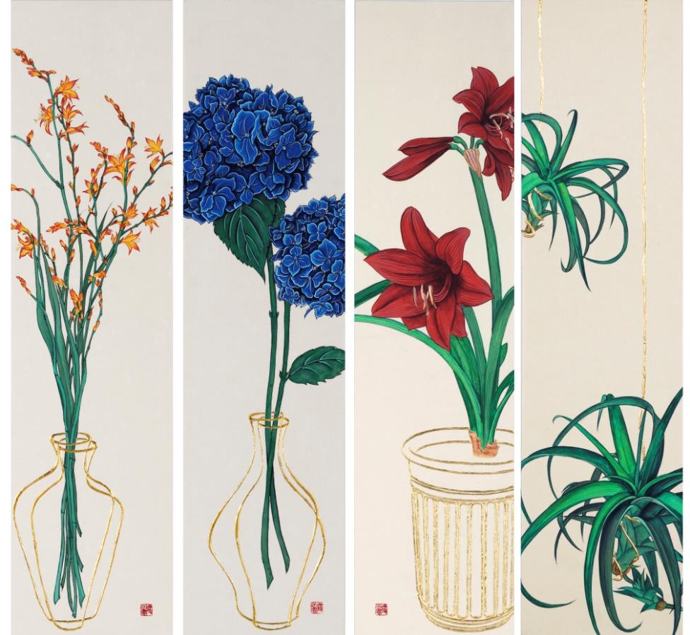 붉은 꽃잎이 돋보이는 '발화-화왕 Ⅱ'가 대표적이다. 천연 안료에 금박, 적박 등을 활용한 이 작품은 '꽃 중의 왕' 모란을 강렬하게 표현했다.