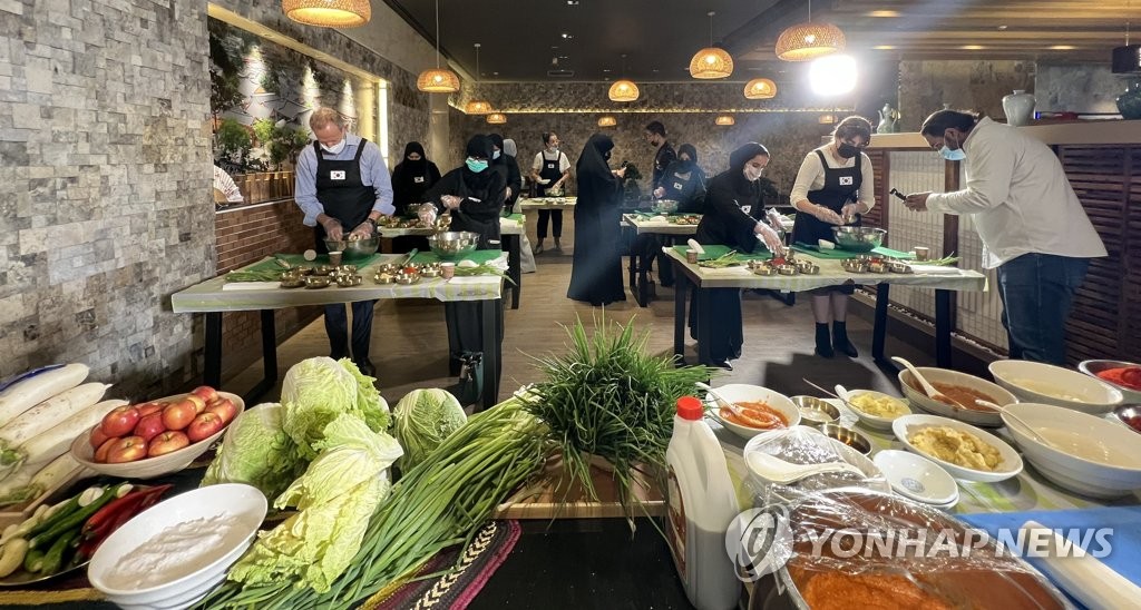 | ▲ UAE서 열린 '김치 만들기 교실' (아부다비=연합뉴스) 18일(현지시간) 아랍에미리트(UAE) 아부다비의 한 식당에서 열린 '김치 만들기 교실'에 참여한 현지인들이 김치 만드는 법을 배우고 있다. 2022.8.19 [주UAE 한국문화원 제공. 재판매 및 DB 금지] logos@yna.co.kr |