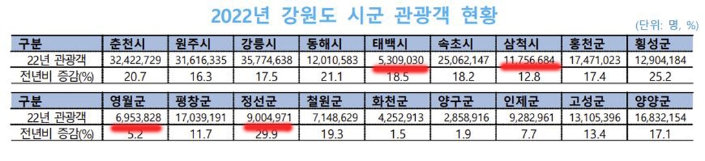 | ▲ 2022년 강원도 시군 관광객 현황 [홍지영 태백시의회 의원 제공.재판매 및 DB 금지] |