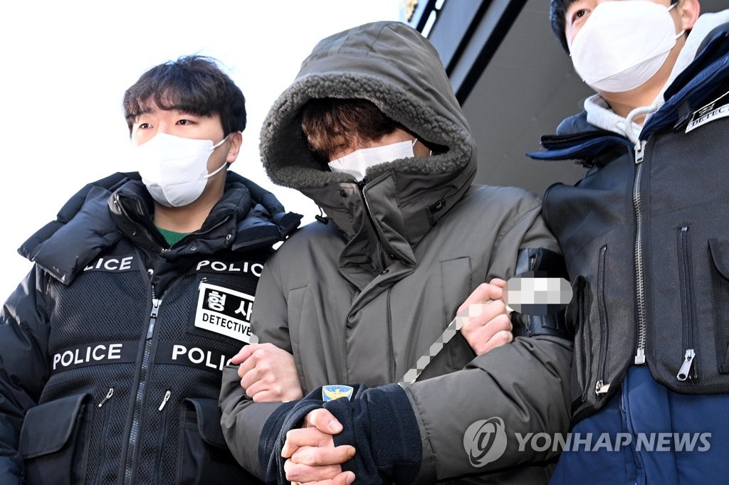 | ▲ This Jan. 4, 2023, file photo shows Lee Ki-young (C), suspected of killing a taxi driver and his former girlfriend, coming out of a police station in Goyang, just northwest of Seoul, to be sent to the prosecution. (Pool photo) (Yonhap) |