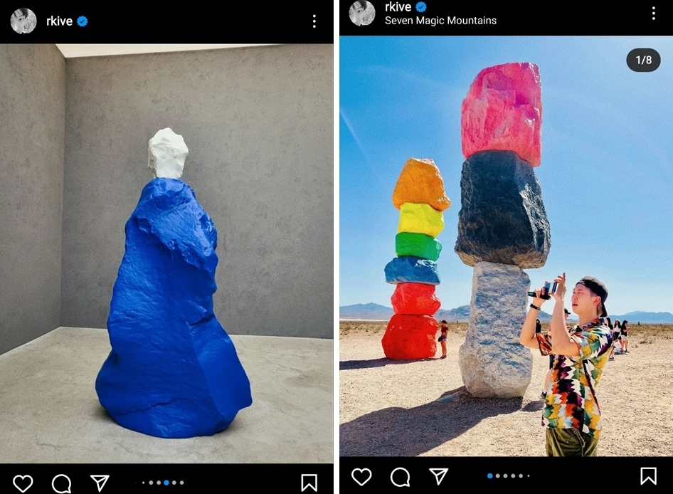 | ▲ RM이 국제갤러리에서 촬영한 우고 론디노네 작품(왼쪽)과 네바다주에 설치된 '세븐 매직 마운틴스' 현장 사진 [RM 인스타그램 갈무리] |