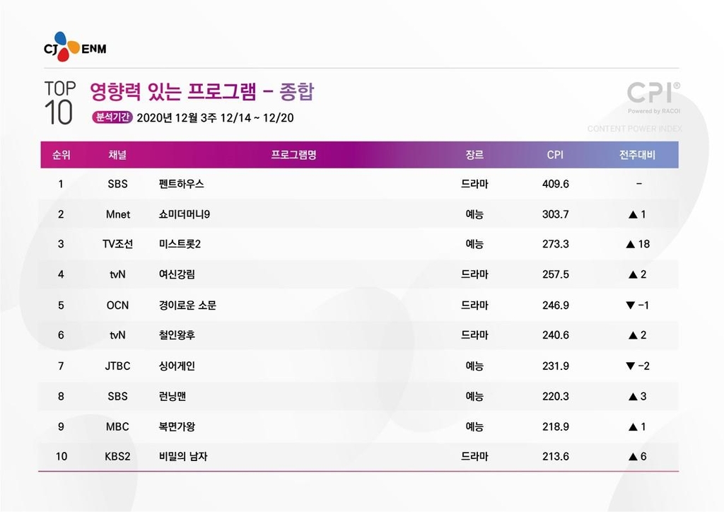 29일 CJ ENM이 발표한 12월 셋째 주(14~20일) 콘텐츠영향력평가지수(CPI·하단용어설명 참조) 집계에서 SBS TV 금토극 '펜트하우스'와 TV조선 트로트 경연 예능 '미스트롯' 시즌2가 각각 1위와 3위를 차지했다. CPI 지수는 409.6과 273.3.