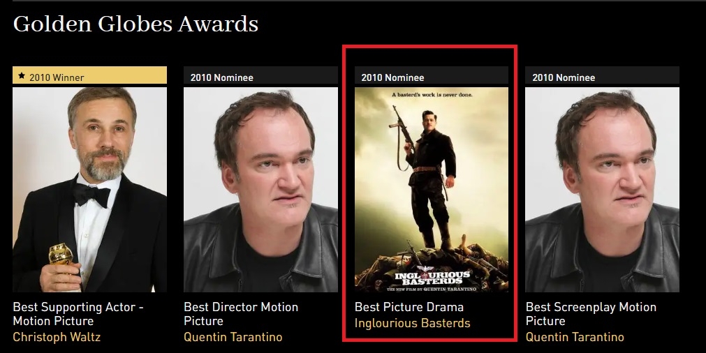 ▲ 2010 골든글로브 최우수 작품상 후보에 오른 '바스터즈: 거친 녀석들(빨간 표시)' 영화정보 사이트 IMDB에 따르면 이 영화는 30%만이 영어대사고 나머지 대부분은 프랑스어나 독일어다. [사진 출처: 골든글로브 홈페이지]