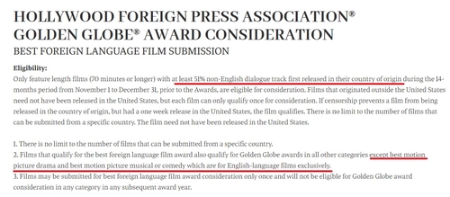 협회는 또한 골든글로브 최고 영예라 할 수 있는 드라마 부문 '최우수 작품상'은 오직 '영어' 영화에 한한다고 명시했다.