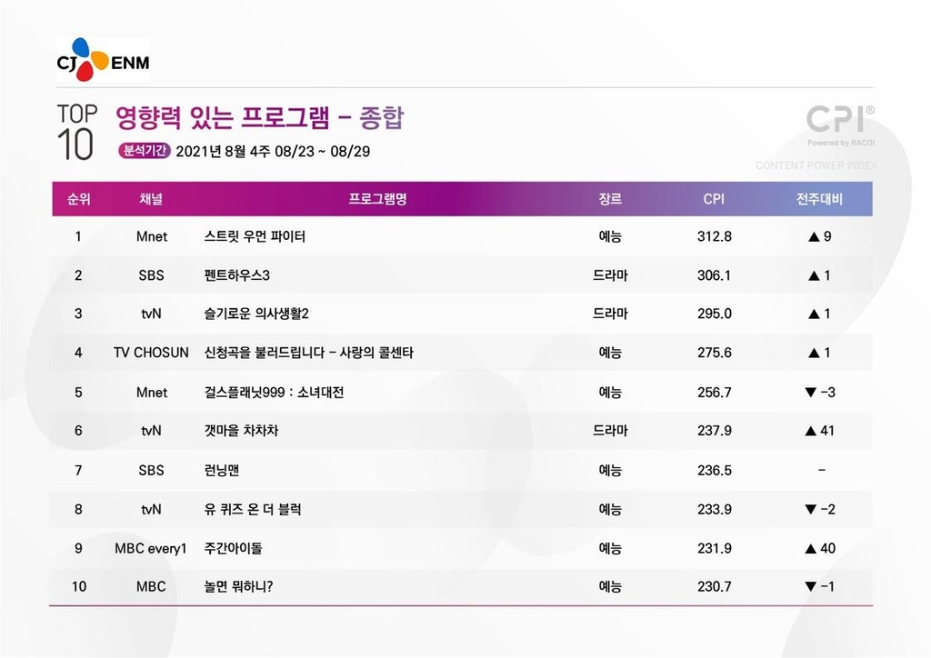 한편, 이번 주 CPI 1위는 엠넷 여성 댄스 경연 예능인 '스트릿 우먼 파이터'가 차지했다. 전주보다 9계단 순위가 상승한 이 프로그램은 CPI 지수도 312.8로 2위인 SBS TV 금요극 '펜트하우스' 시즌3(306.1)와 격차를 벌렸다.
