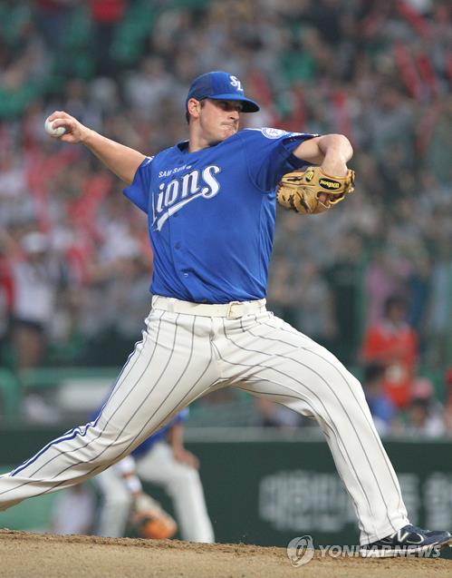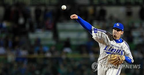 | ▲ In this file photo from Oct. 25, 2011, Doug Mathis of the Samsung Lions pitches against the SK Wyverns in the top of the first inning of Game 1 of the Korean Series at Daegu Citizen Stadium in Daegu, 300 kilometers southeast of Seoul. (Yonhap) |