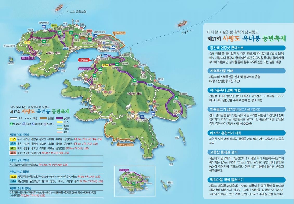 22일까지 옥녀봉 일대와 사량중학교 등에서 바지락·홍합 까기 대회, 맨손 물고기 잡기 체험 등 사량도를 알리는 다양한 행사가 열린다.