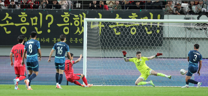 Eom Ji-sung (4th from L) of South Korea scores the team's first goal in the first half of an international friendly against Paraguay at Seoul World Cup Stadium in Seoul on Oct. 14, 2025. South Korea won the match 2-0. (Yonhap)