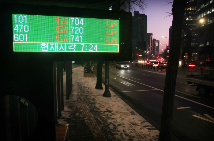 An electric board at a bus stop in Seoul on Jan. 13, 2026, shows "Buses at Garages" as unionized intracity bus workers in the capital went on an indefinite strike after their wage hike negotiations with management broke down earlier in the day. (Yonhap)