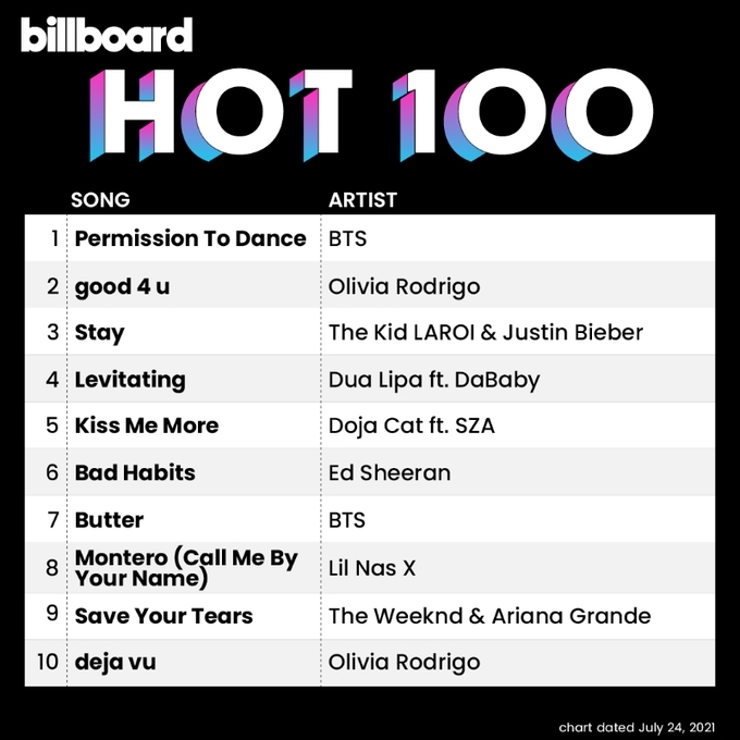 ▲ This image, shared on Billboard's official Twitter account, shows this week's Billboard Hot 100 chart. BTS secured the No. 1 spot on the Billboard main singles chart with its new song "Permission to Dance" on the chart dated July 24, 2021. (PHOTO NOT FOR SALE) (Yonhap)