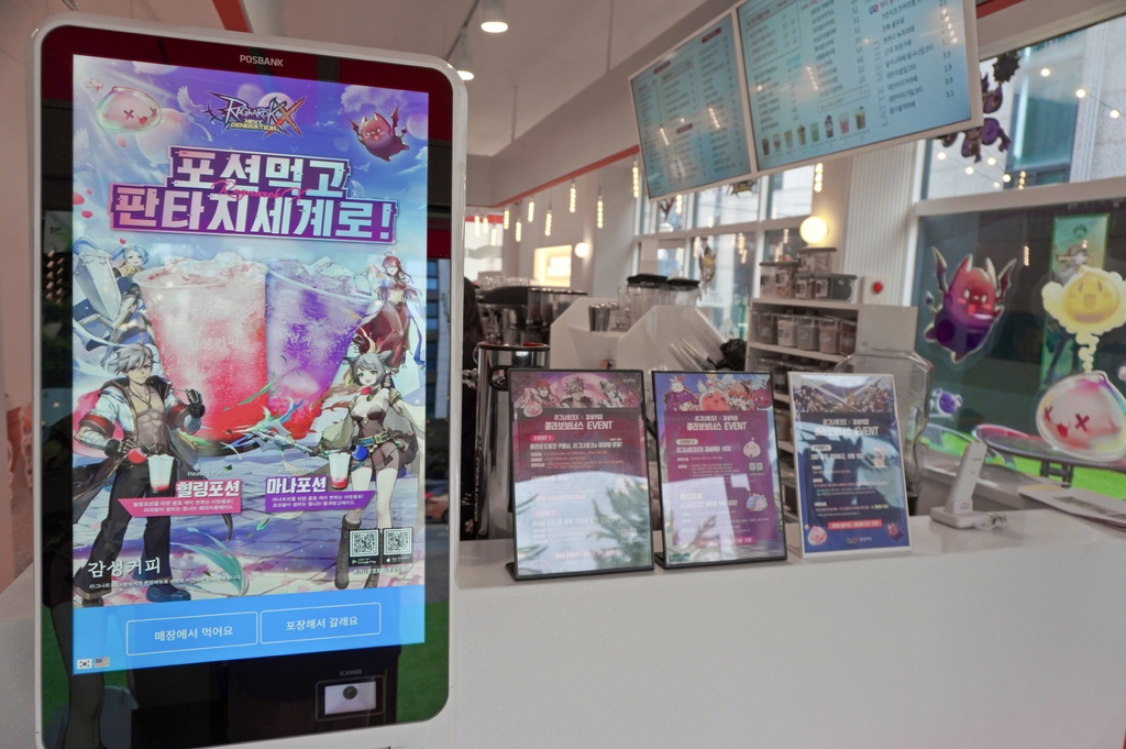 ▲ 그라비티는 이달 31일까지 다중접속역할수행게임(MMORPG) '라그나로크X' 출시 0.5주년을 기념해 카페 브랜드 '감성커피'와 서울 송파구에 협업 카페를 운영한다. 운영 시간은 매일 오전 9시부터 오후 9시 30분까지로, 카페 안팎을 '라그나로크X' 캐릭터를 활용해 꾸민 것이 특징이다. 협업 매장에서는 '라그나로크X' 속 '힐링포션'과 '마나포션'을 모티브로 제작한 특별 음료 2종도 함께 선보인다. (서울=연합뉴스)
