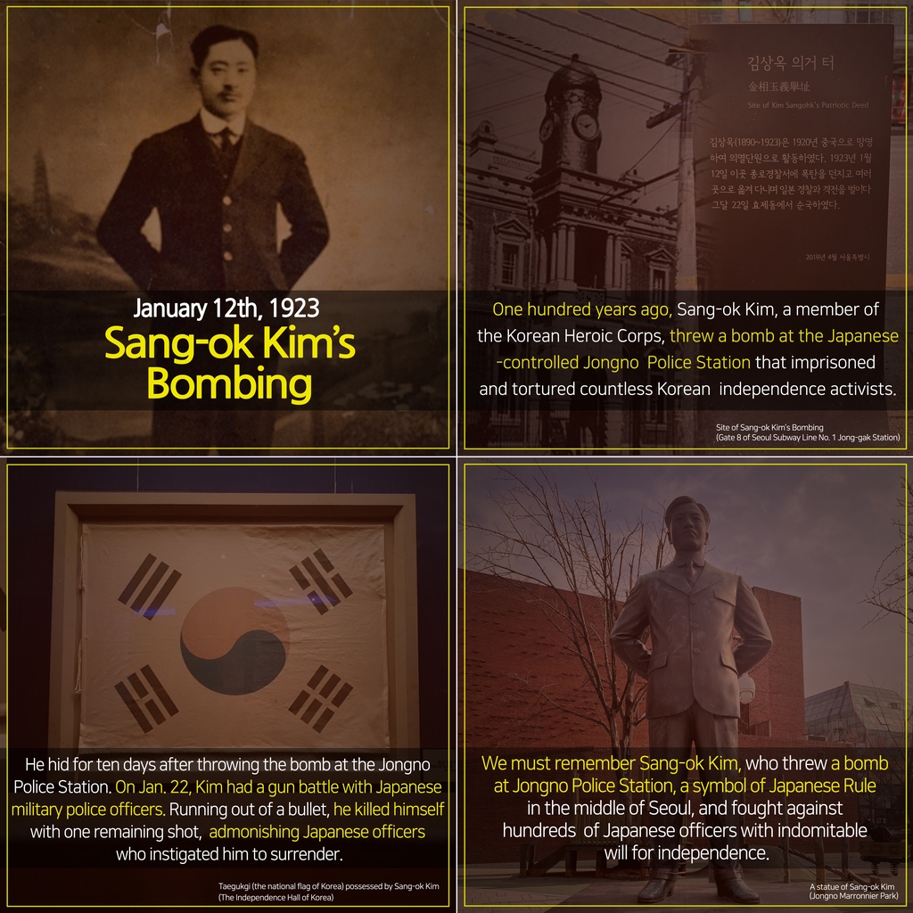 카드뉴스에는 "의열단원 김상옥 의사는 수많은 독립운동가를 탄압하던 일제 종로경찰서에 폭탄을 던지는 의거를 했다"며 "의거 이후 10여 일간 은신하던 김상옥은 1월 22일 일제 경찰수색대와 교전 중 탄환이 모두 소모되자 항복을 권유하는 일제 경찰을 꾸짖으며 마지막 남은 총탄으로 자결했다"고 소개했다.