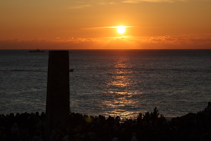 People look at 2026's first sunrise at Cape Ganjeol, a coastal point where the sunrise can be viewed the earliest on the Korean Peninsula, on the coast of Ulsan in southeastern South Korea on Jan. 1, 2026. (Yonhap)