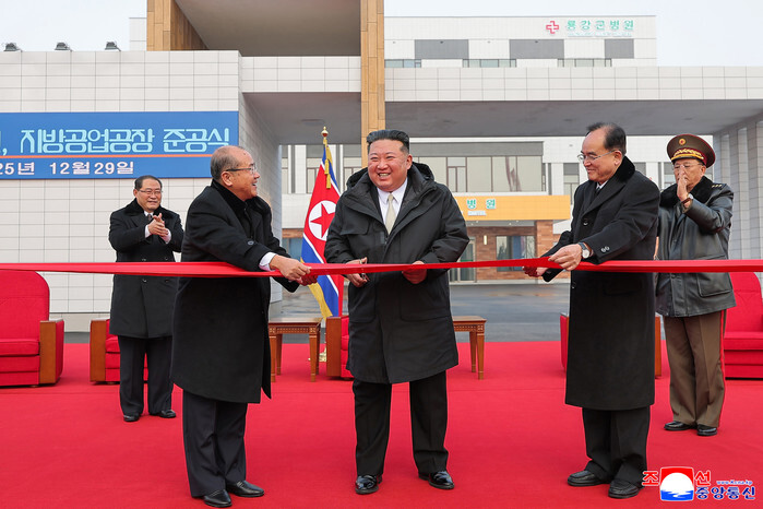 North Korean leader Kim Jong-un (C) attends a tape-cutting ceremony marking the completion of a hospital and an industrial complex in the western coastal city of Nampho on Dec. 29, 2025, in this photo released by the North's official Korean Central News Agency the next day. (For Use Only in the Republic of Korea. No Redistribution) (Yonhap)