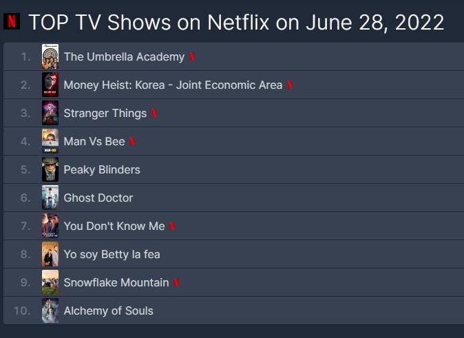 28일 기준 넷플릭스 TV 프로그램 부문 10위권에는 지난 2월 종영한 정지훈·김범 주연의 tvN 드라마 '고스트 닥터'가 6위, 현재 방영 중인 이재욱·정소민 주연의 tvN 드라마 '환혼'이 10위에 이름을 올렸다.
