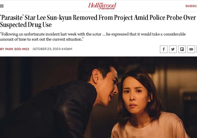 미국 연애 매체 할리우드리포터는 "'기생충' 스타 이선균이 마약 투약 의혹 경찰 조사로 새 프로젝트인 드라마 '노 웨이 아웃'에서 하차했다"고 보도했다.