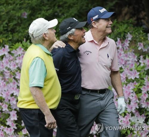 | ▲ 니클라우스(왼쪽부터), 플레이어와 함께 오거스타 내셔널 골프클럽을 걷는 왓슨. [AP=연합뉴스] |