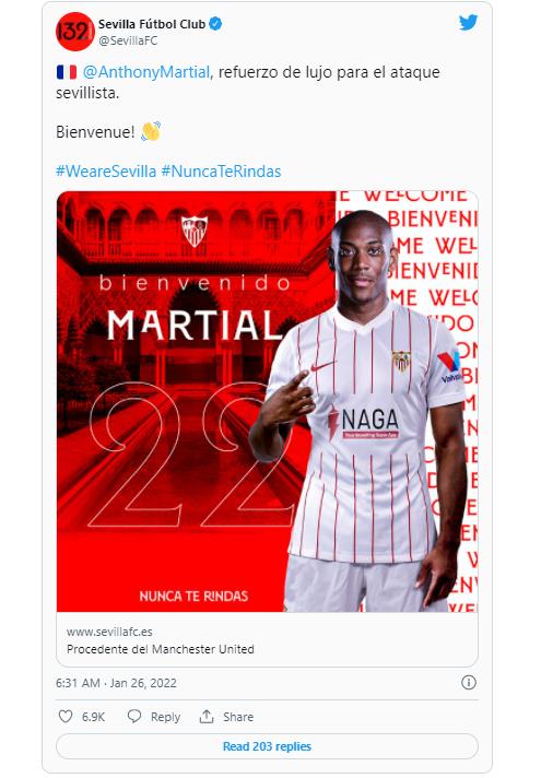 | ▲ 앙토니 마르시알의 임대 영입을 발표한 세비야. [세비야 구단 트위터. 재판매 및 DB 금지] |