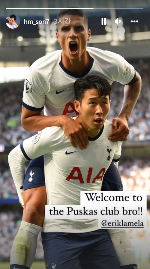 손흥민은 19일(한국시간) 자신의 사회관계망서비스(SNS)에 라멜라와 골 세리머니를 했던 사진과 함께 "푸슈카시 클럽에 가입한 걸 환영해!" (Welcome to the Puskas club bro!)라는 글을 남겼다.