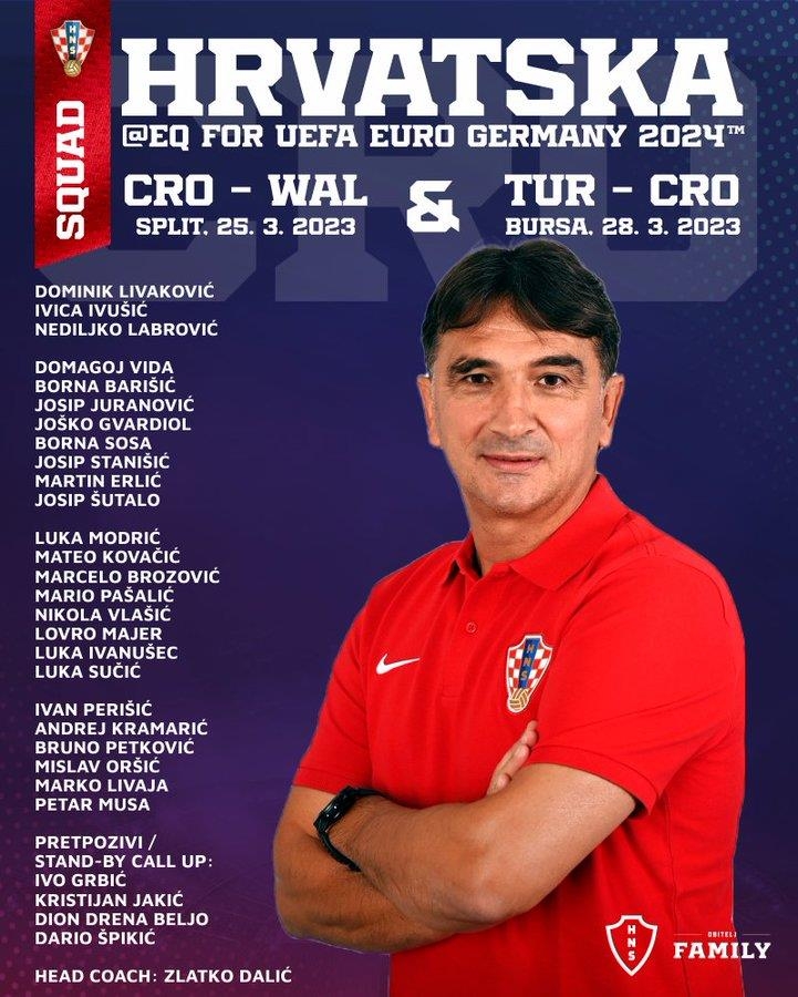 크로아티아축구협회는 7일(한국시간) 다가오는 유럽축구선수권대회(유로 2024) 예선에 출전할 25인의 선수들과 예비 인원 4명까지 총 29인의 국가대표 명단을 발표했다.