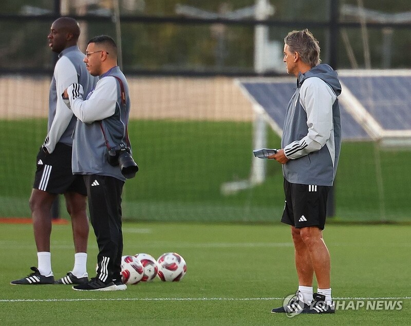 | ▲ 선수들 훈련 바라보는 만치니 감독 (도하=연합뉴스) 김도훈 기자 = 한국과 아시안컵 16강전을 앞둔 사우디아라비아 로베르토 만치니 감독이 28일(현지시간) 카타르 도하 아스파이어 훈련장에서 훈련하는 선수들을 체크하고 있다. 2024.1.29 superdoo82@yna.co.kr |