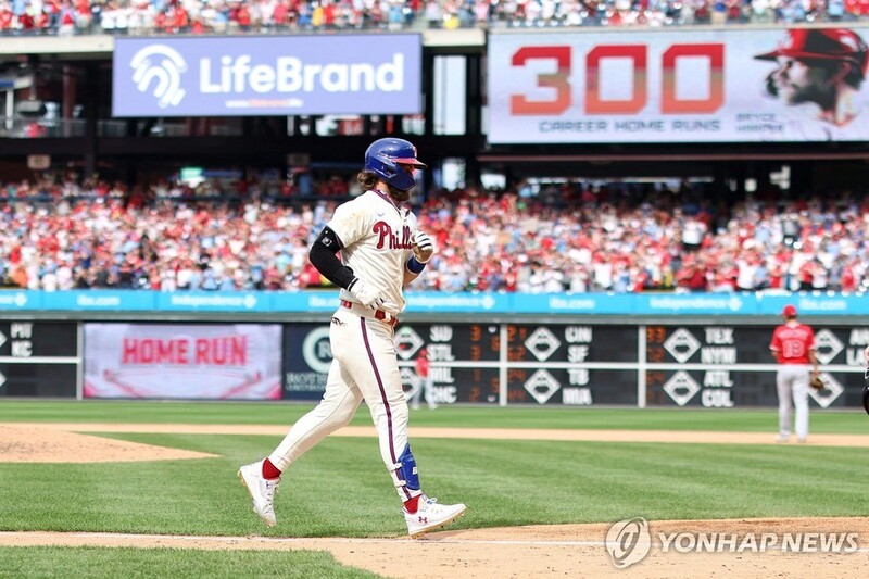 (서울=연합뉴스) 이대호 기자 = 필라델피아 필리스를 대표하는 강타자 브라이스 하퍼(30)가 빅리그 12년 차에 통산 300홈런 고지를 정복했다.