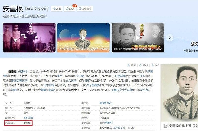 서 교수는 사회관계망서비스(SNS)를 통해 "바이두가 윤동주와 관련해 몇 년간 '민족'을 '조선족'으로 명시했다"며 "최근 바이두를 검색하던 중 안중근 의사와 관련해 '민족집단'을 '조선족'으로 표기한 것을 발견했다"고 설명했다.