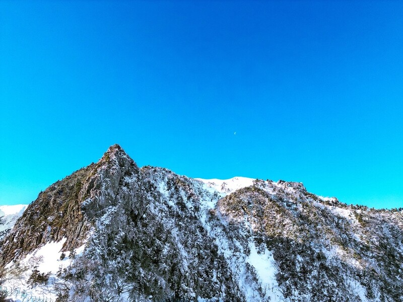 눈 덮인 백록담을 둘러싼 능선에는 바람이 세차게 불었다.