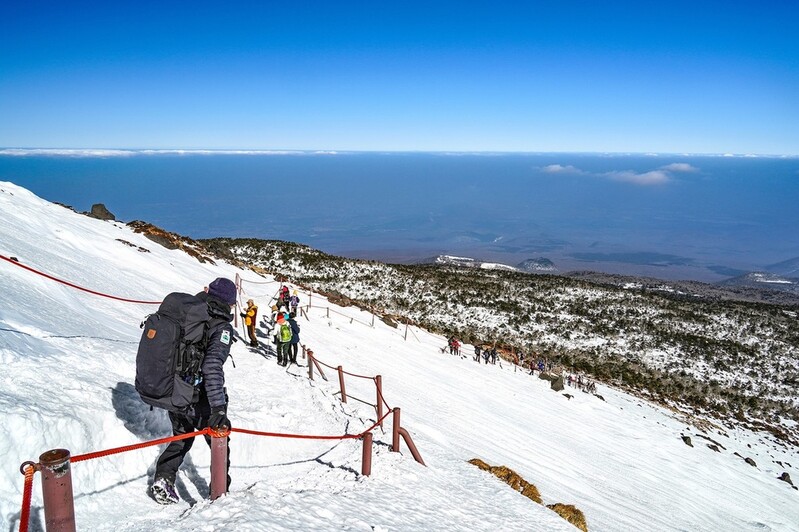 새해 벽두에 한라산 정상에 오른 내외국인 탐방객들은 백록담 표지석을 안고 기념 촬영을 하기 위해 수백m에 이르는 긴 줄을 짓고 있었다. 새파란 겨울 창공에서 내리쬐는 햇볕은 그들을 축복하는 듯 따사로웠다.