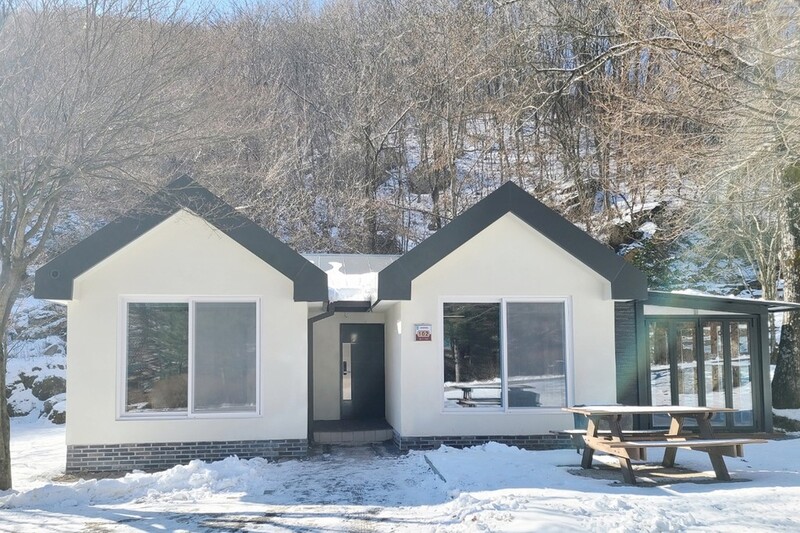 겨울철에는 따뜻한 숲속의 집 안에서 유리창 너머로 나뭇가지마다 소복이 내려앉은 함박눈을 감상할 수 있다.