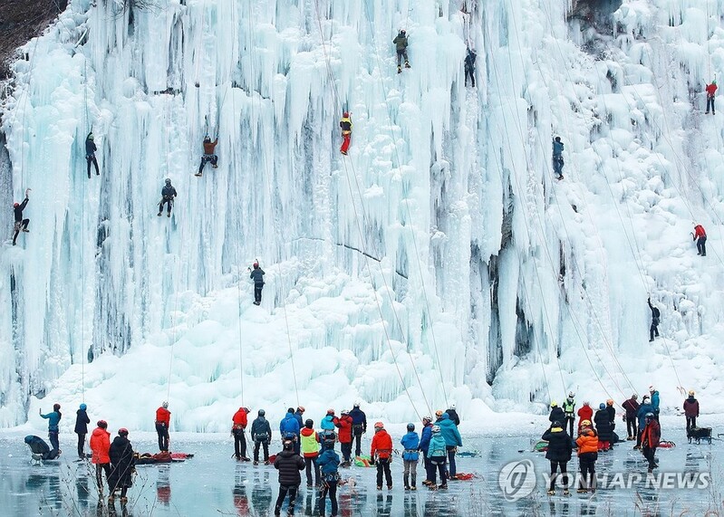 | ▲ 거대한 빙벽의 정상을 향해 (원주=연합뉴스) 이재현 기자 = 연일 지속된 최강 한파가 다소 누그러진 27일 강원 원주시 지정면 판대아이스파크 빙벽장을 찾은 동호인들이 꽝꽝 언 빙벽을 오르고 있다. 2024.1.27 jlee@yna.co.kr |