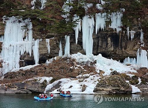 | ▲ 이한치한 래프팅 (철원=연합뉴스) 양지웅 기자 = 21일 강원 철원군 한탄강 일원에서 열린 제12회 철원 한탄강 얼음 트래킹 축제를 찾은 관광객들이 거대 빙벽을 배경으로 래프팅을 즐기며 겨울 추억을 만들고 있다. '겨울날의 마실, 한탄강 자연 따라서'를 주제로 지난 13일 개막한 이번 축제는 주최 측 추산 방문객 18만여명을 기록하며 이날 성료했다. 2024.1.21 |