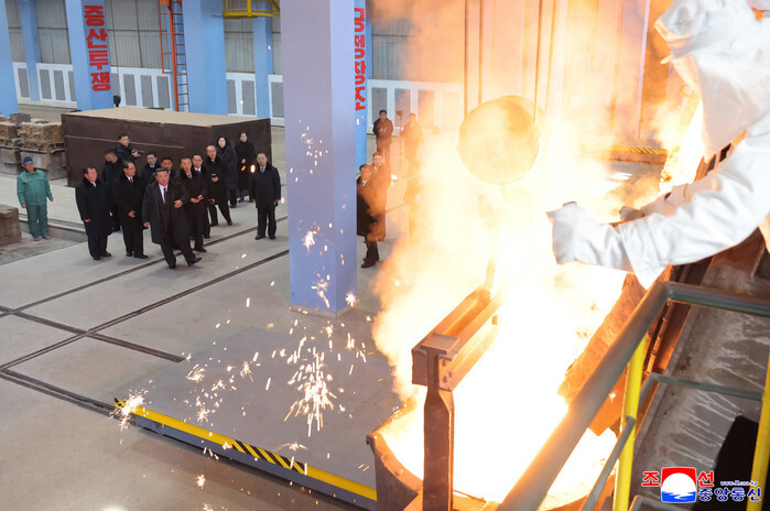 North Korean leader Kim Jong-un (C, rear) inspects the Ryongsong Machine Complex in Hamheung, South Hamgyong Province, northeastern North Korea, on Jan. 19, 2026, during a ceremony to mark the completion of the first stage of the complex's modernization project, in this photo released by the North's official Korean Central News Agency the next day. (For Use Only in the Republic of Korea. No Redistribution) (Yonhap)