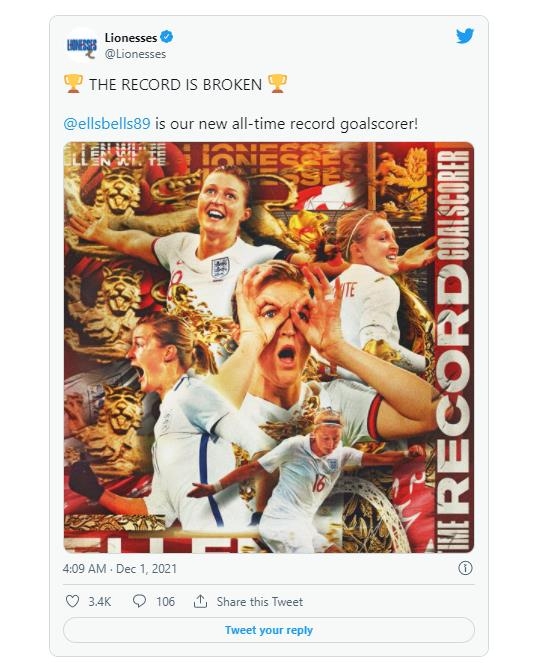 | ▲ A매치 한 경기 최다골 기록 경신 소속을 전한 잉글랜드 여자축구 대표팀. [잉글랜드 여자축구 대표팀 트위터. 재판매 및 DB 금지] |