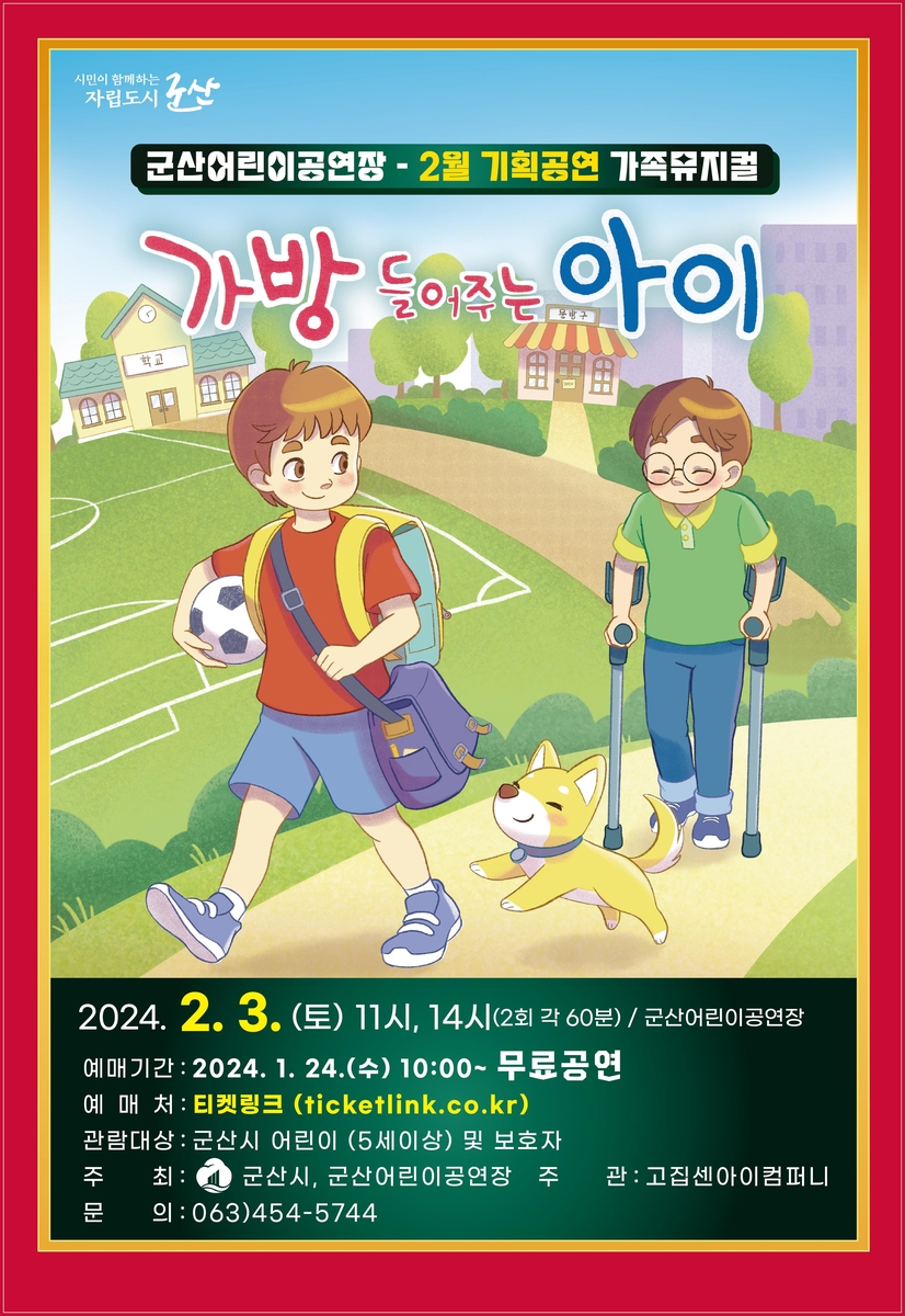 (군산=연합뉴스) 군산시 어린이공연장은 2월 3일 오전 11시와 오후 2시에 가족 뮤지컬 '가방 들어 주는 아이'를 공연한다.