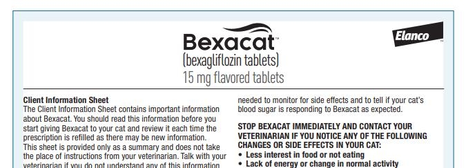 FDA 홈페이지에 공개된 동물용 의약품 승인 현황 데이터베이스에 따르면 벡사캣은 인슐린 치료의 전력(前歷)이 없는 고양이의 혈당 조절 개선에 쓰일 수 있다. 하루에 15mg짜리 알약 한 알을 먹이는 방식이다.