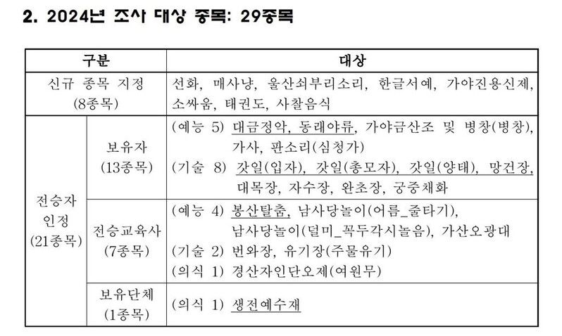 | ▲ 2024년 국가무형문화재 지정(인정) 조사 대상 종목 [문화재청 제공. 재판매 및 DB 금지] |