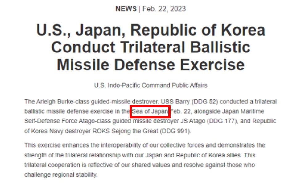 미국 인도태평양사령부가 지난 22일 동해 공해에서 북한의 대륙간탄도미사일(ICBM) 등 미사일 도발에 대응한 미사일 방어훈련을 할 때 훈련 장소를 일본해로 표기하자 우리 군 당국과 외교부도 동해로 수정을 요구한 바 있다.