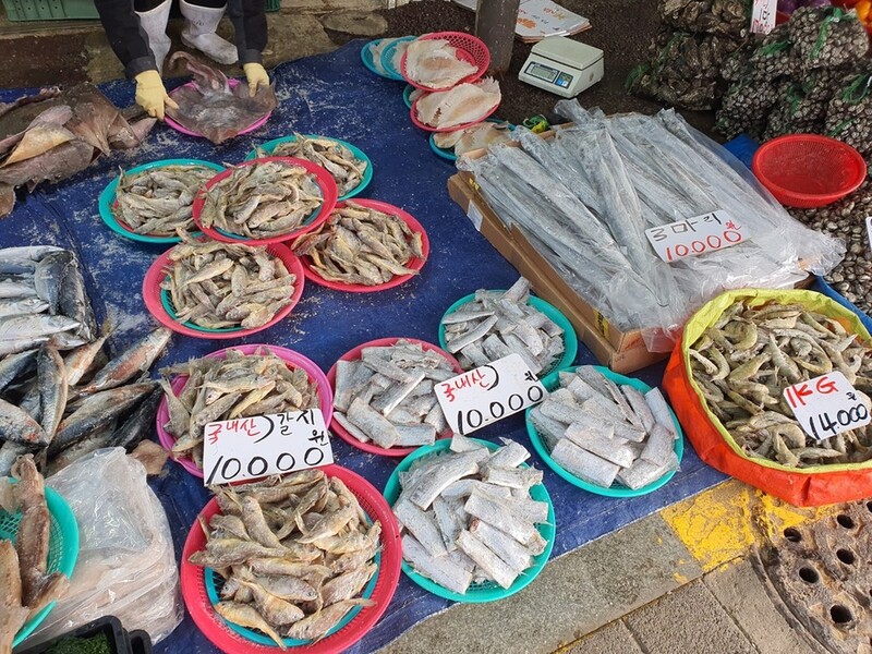 길이 20㎝가량의 조기 10마리는 5만원에 팔렸다. 중간 크기의 병어 3마리(5만원)와 꼬막 1㎏(1만원), 냉동 대구포(7천원)를 샀다.