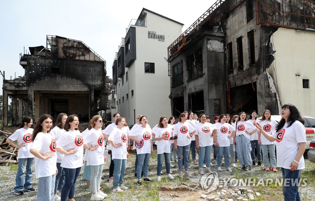 | ▲ 강릉 산불 피해지에서 공연하는 우크라이나 합창단 (강릉=연합뉴스) 유형재 기자 = 강원 강릉에서 열리는 2023 강릉 세계합창대회에 참가한 우크라이나 보그닉 소녀합창단이 3일 오후 지난 4월 발생한 대형산불로 불에 탄 경포의 한 펜션 앞에서 공연하며 희망의 메시지를 전하고 있다. 2023.7.3 yoo21@yna.co.kr |